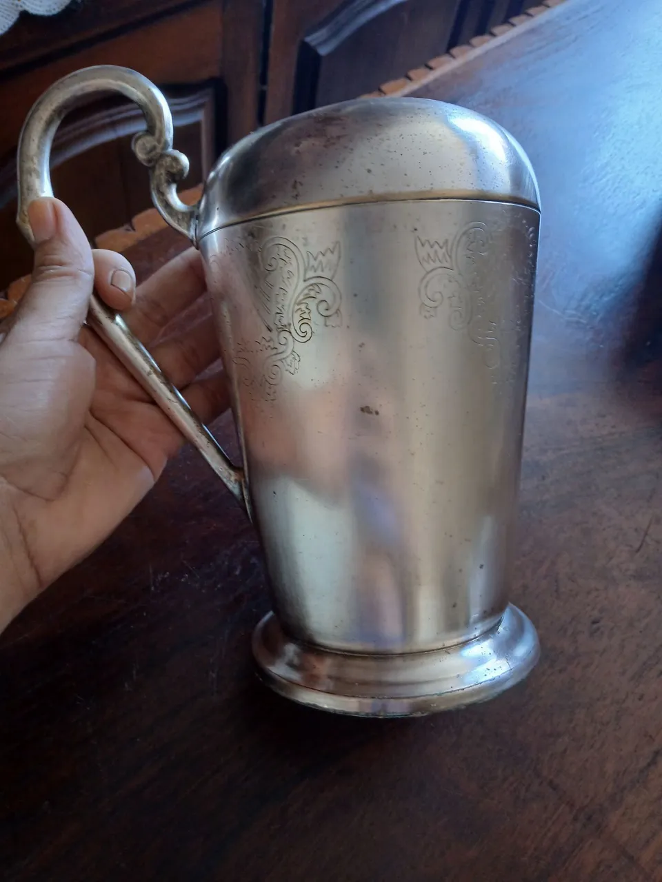Linda jarra antiga de metal com detalhes gravados. Peça elegante e charmosa para colecionadores ou para adicionar um toque vintage à sua decoração.
