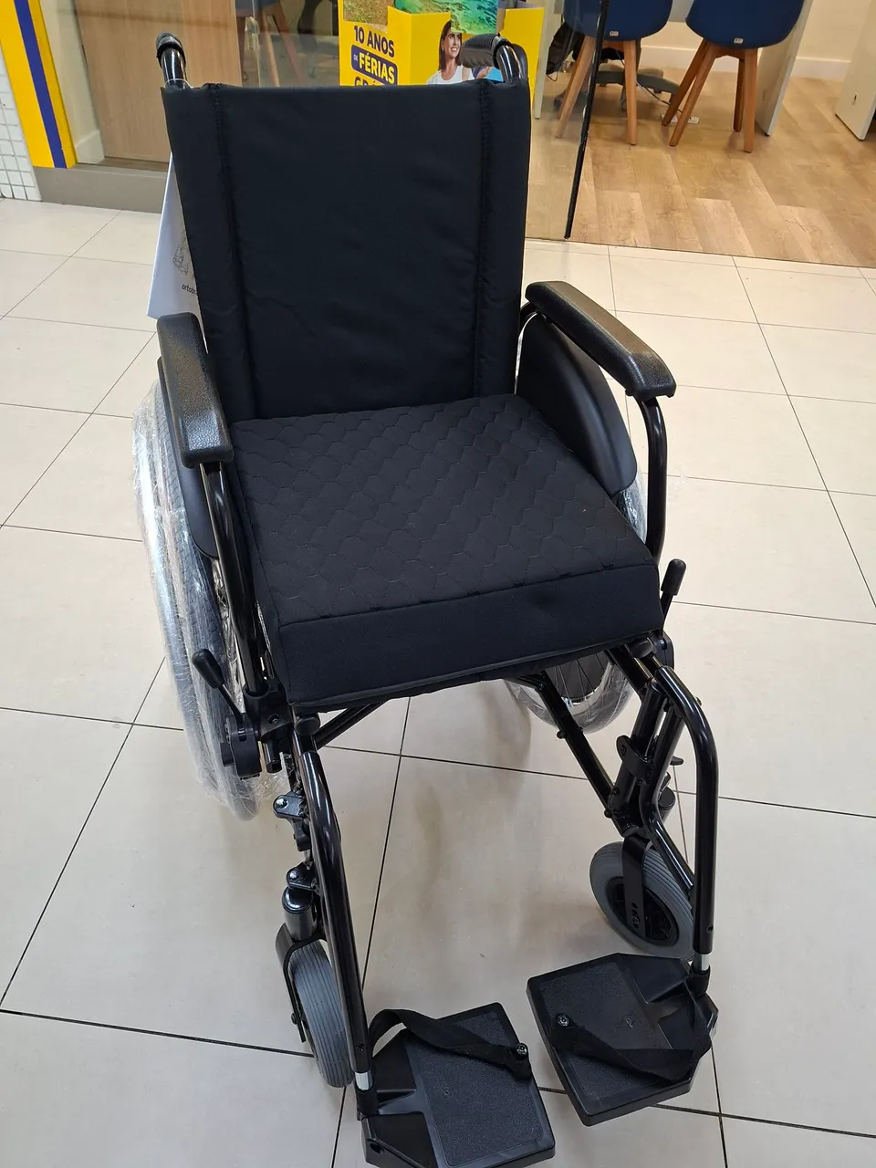 Peso suportado até 140kg, assento almofadado 40cm, 44cm, almofada Balance,encosto acolchoado, rodas em pneu inflável, apoio de braços escamoteável, apoio de pés escamoteável , rodas traseiras removíveis em Quick, rodas dianteiras removíveis. Estrutura dobrável em X duplo.