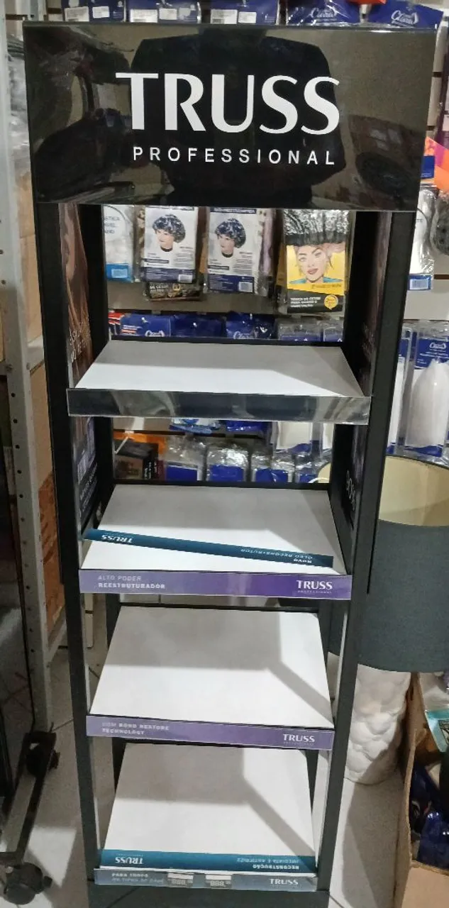 Expositor de shampoo Truss Professional, ideal para organizar e destacar seus produtos de cabelo. Design moderno e funcional, perfeito para salões de beleza e revendedores. Zap 9 81... ver número. Não entrego.