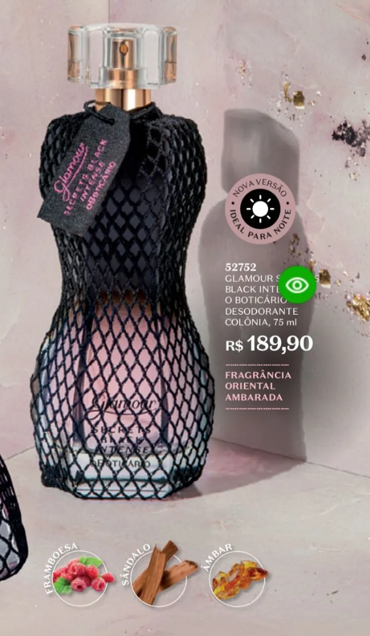 Glamour Secrets Black Intense de O Boticário, uma fragrância oriental ambarada que irradia sofisticação e mistério. Perfeito para realçar sua personalidade e deixar uma marca inesquecível.