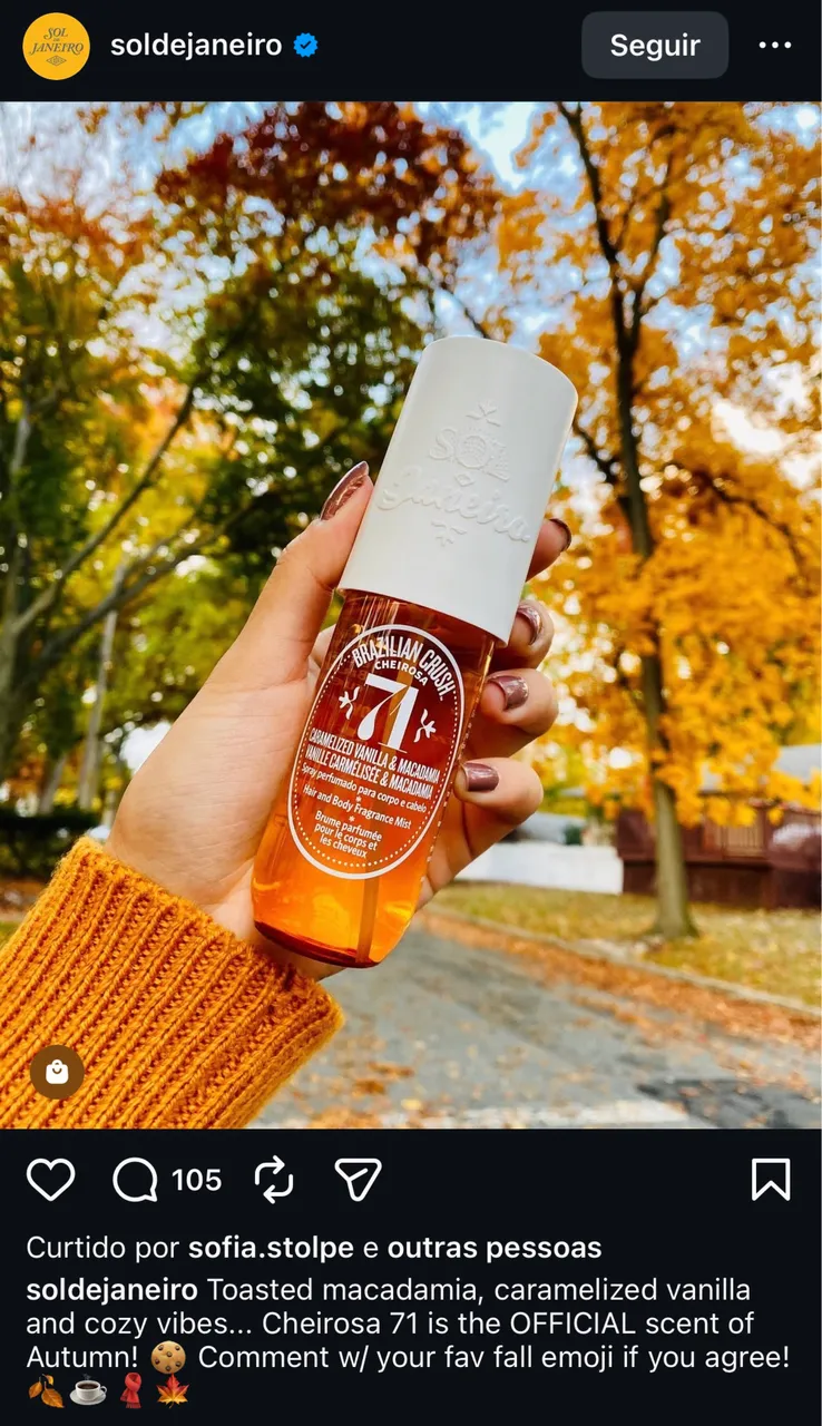 Experimente a fragrância irresistível do Brazilian Crush Cheirosa 71! Uma bruma perfumada para corpo e cabelo com notas de baunilha caramelizada e macadâmia, perfeita para um toque de doçura e aconchego. Vidro praticamente cheio!