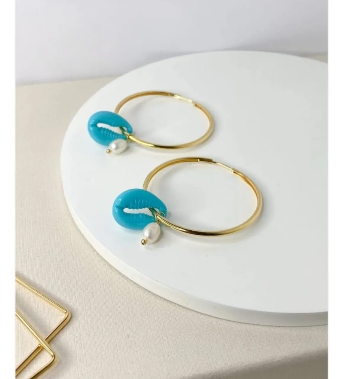Lindos brincos de argola dourada com pingente de concha azul turquesa e pérola. Perfeitos para um look praiano e elegante!