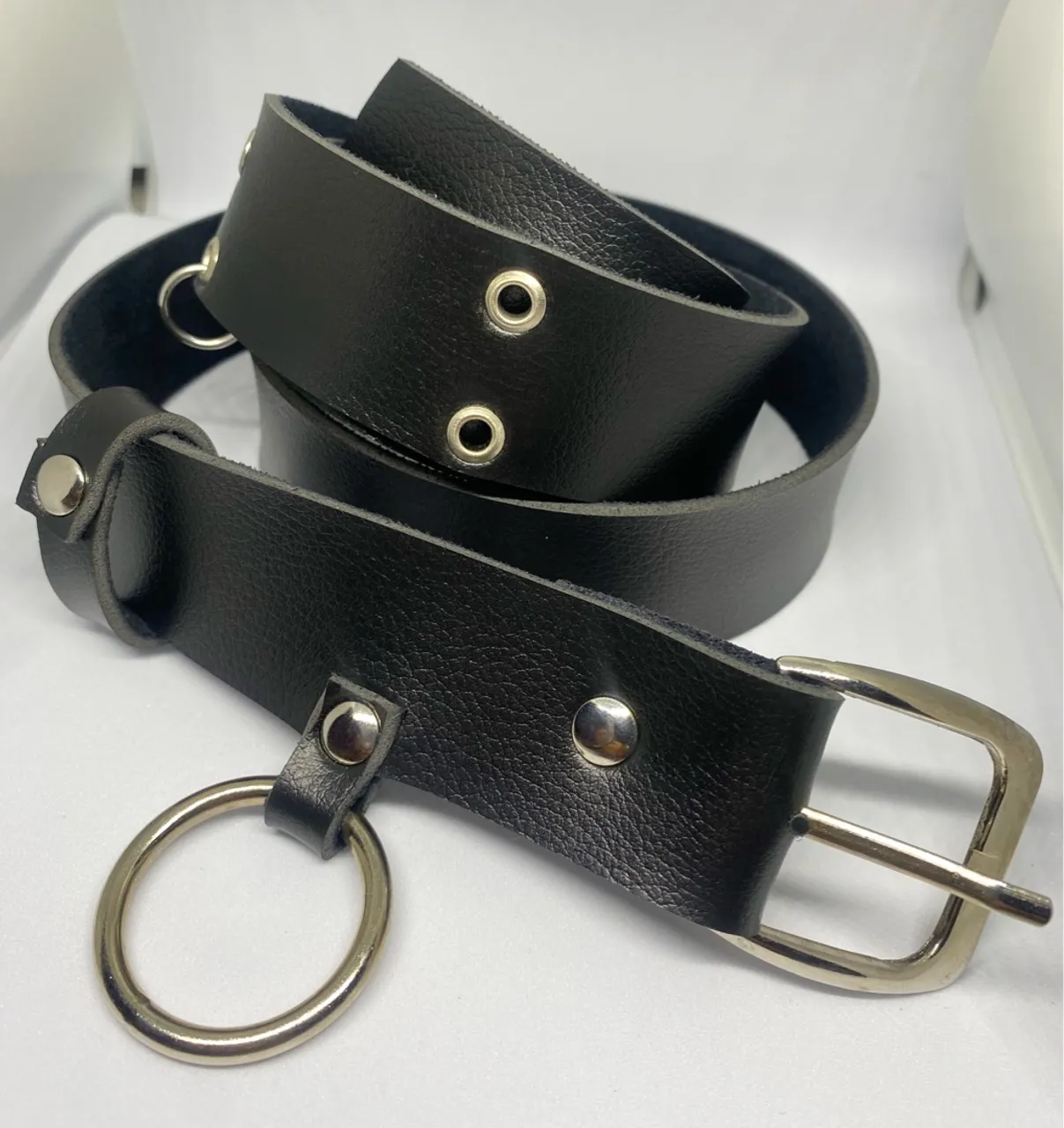 Cinto de couro preto com fivela e argola, ideal para complementar o seu look. Feito com couro macio e resistente, ele é perfeito para usar em diversas ocasiões.