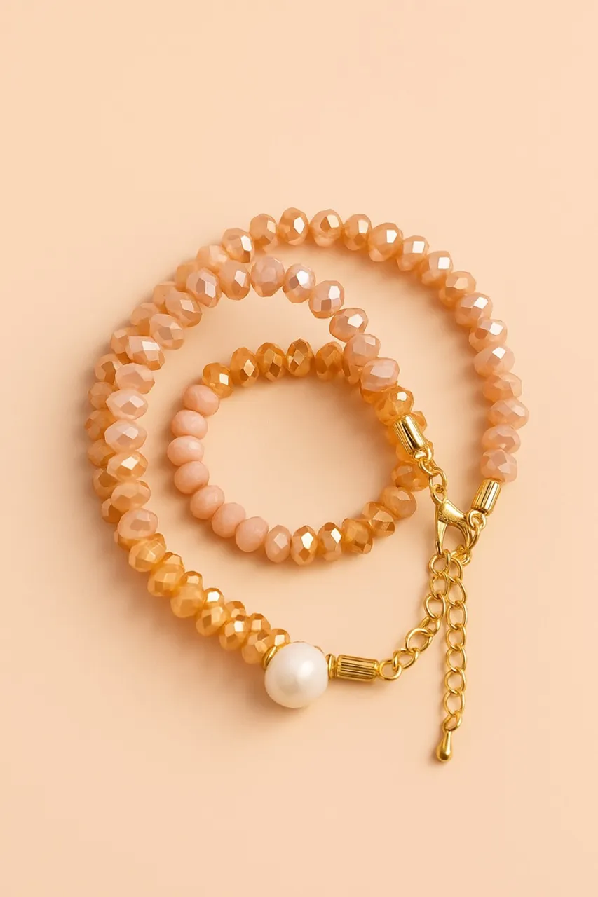 Lindo colar com contas facetadas em tons de nude e detalhe de pérola. Elegância e charme para qualquer ocasião.