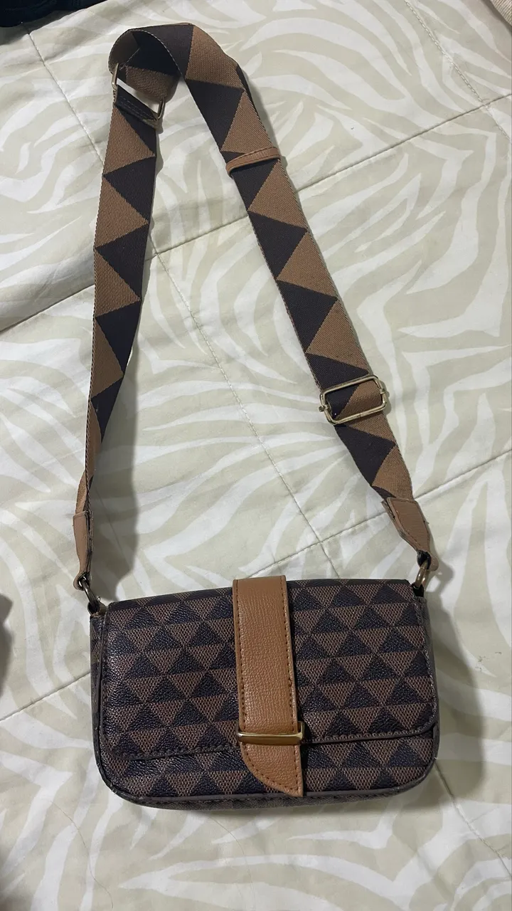 Bolsa Transversal em PU com Alça de Gorgurão e Estampa Triangular Marrom. Está em ótimo estado sem nenhuma avaria. 91 9... ver número