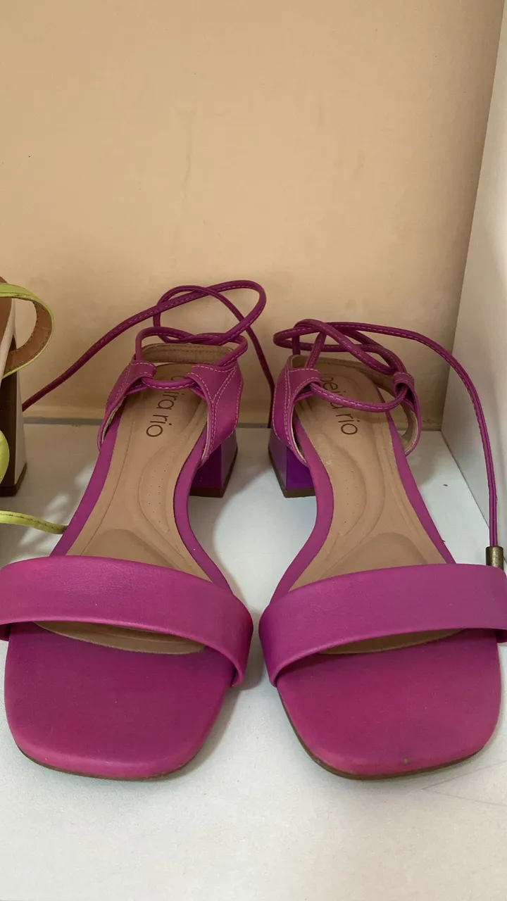 Sandália salto rosa vibrante, ideal para diversas ocasiões. Design moderno e confortável.