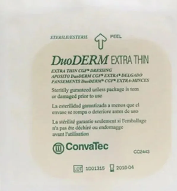 Curativo DuoDERM Extra Thin CGF, ideal para feridas superficiais. Promove a cicatrização em ambiente úmido, protegendo contra contaminações. Confortável e discreto, perfeito para o cuidado de ferimentos.