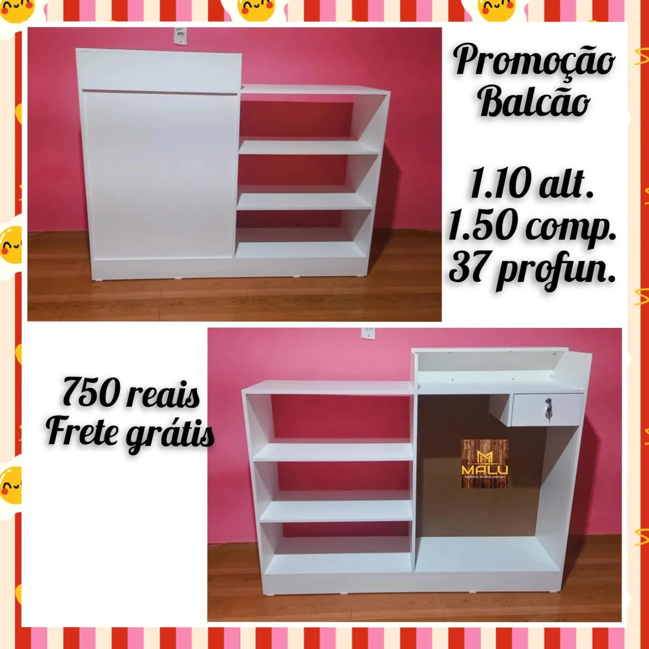 Aproveite a promoção de balcão! Com 1.10m de altura, 1.50m de comprimento e 37cm de profundidade, este balcão é perfeito para o seu comércio. E o melhor, frete grátis!