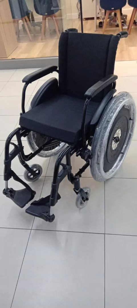 Em alumínio, peso suportado até 120kg, assento 40cm, almofadado, encosto acolchoado, apoio de braços escamoteável, apoio de pés reguláveis e removíveis, protetor de roupas, rodas em pneu inflável, rodas removíveis em Quick, rodas dianteiras removíveis, fechamento em duplo X.