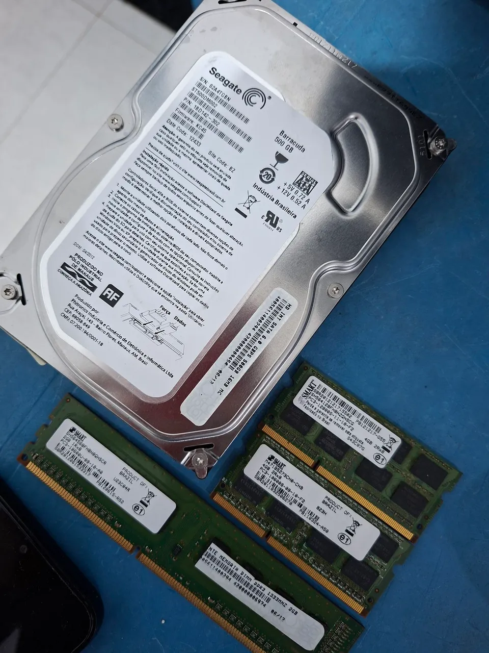 HD 500GB, memória ram PC e duas de notebook, DDR3, usados.