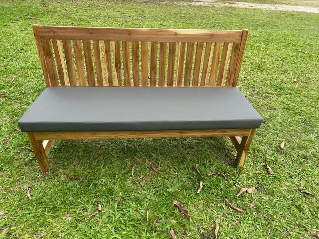 Banco de madeira teca com assento acolchoado, ideal para áreas externas e internas. Conforto e elegância em um só produto.