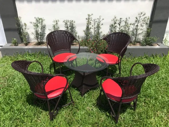 Desfrute do conforto e estilo com o Conjunto Brasil! Perfeito para áreas externas, este conjunto combina design moderno com durabilidade. As cadeiras com assentos vermelhos e estrutura marrom proporcionam um toque vibrante e acolhedor ao seu espaço.