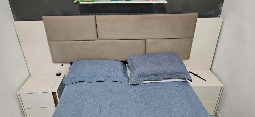 Cabeceira de cama com 02 mesas. Cabeceira em estado de novo, sem detalhes. Retirada na Sacramenta. Ainda montada.