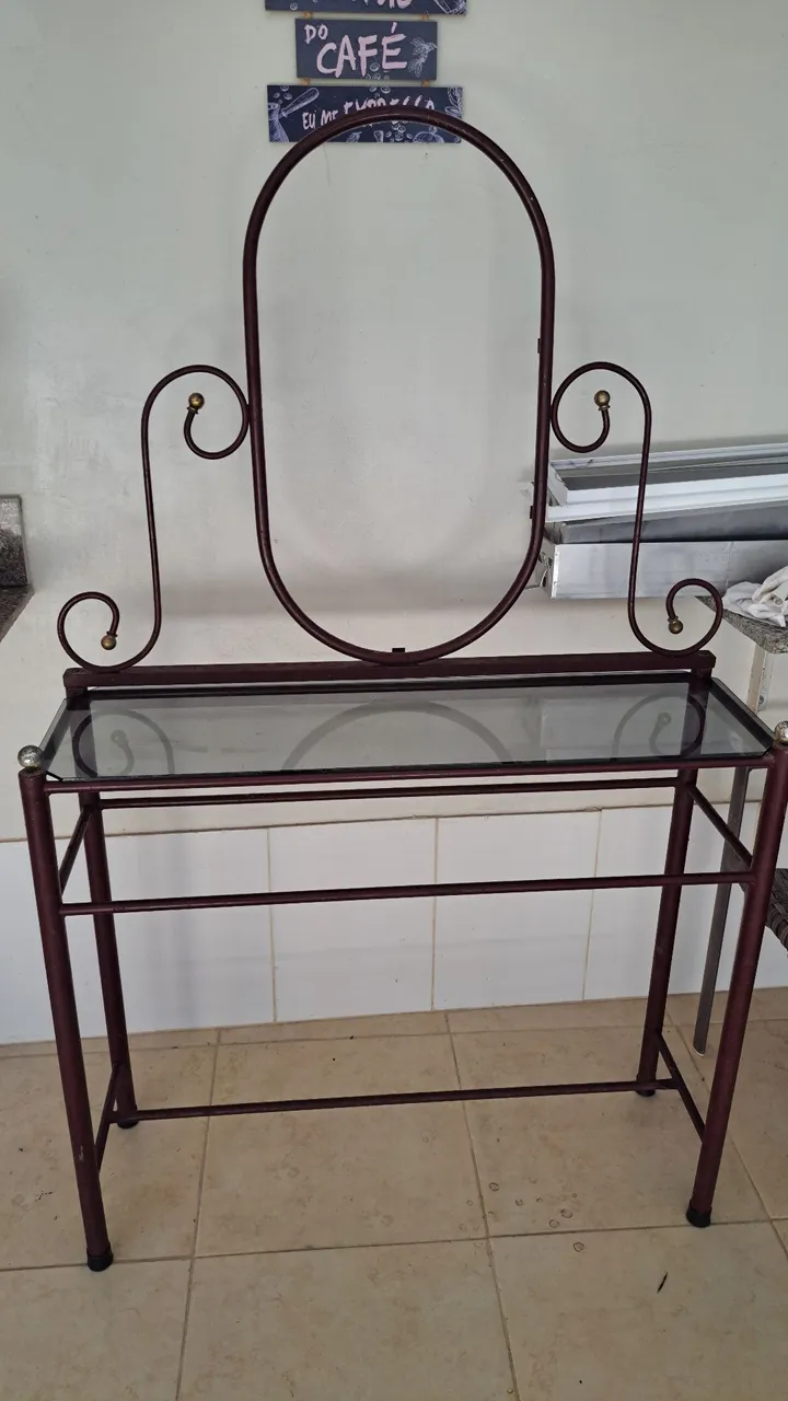 Penteadeira com de ferro. Com 1 vidro, mas tem espaço pra outro em baixo. Com espaço pra colocar espelho. Somente retirada, não é possível entregar.
