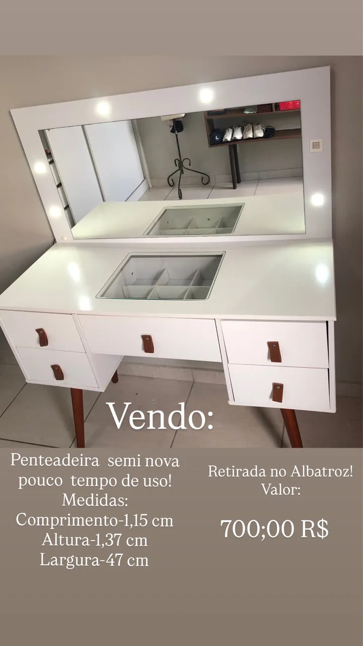 Linda penteadeira camarim semi nova, com espelho e iluminação. Ideal para maquiagem e organização. Design moderno e elegante, perfeita para seu quarto!