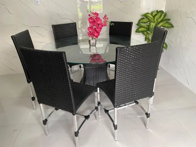 Conjunto de mesa Dubai com 6 cadeiras, ideal para sua área de lazer ou sala de jantar. Design moderno e elegante, perfeito para reunir amigos e familiares.