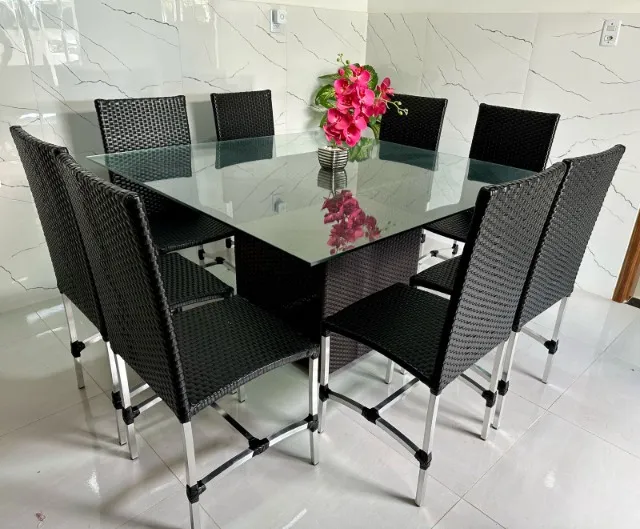 Linda mesa Dubai com 8 cadeiras, perfeita para sua sala de jantar ou área gourmet. Design moderno e elegante, ideal para reunir a família e amigos em momentos especiais.