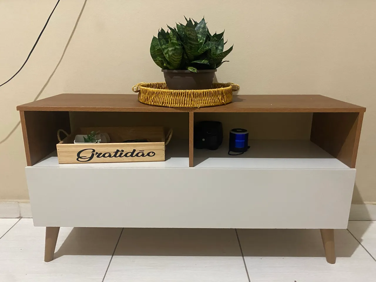 rack possui 2 prateleiras abertas e 1 compartimento com porta altura: 67,5 cm largura: 97 cm comprimento 30 cm aceito proposta