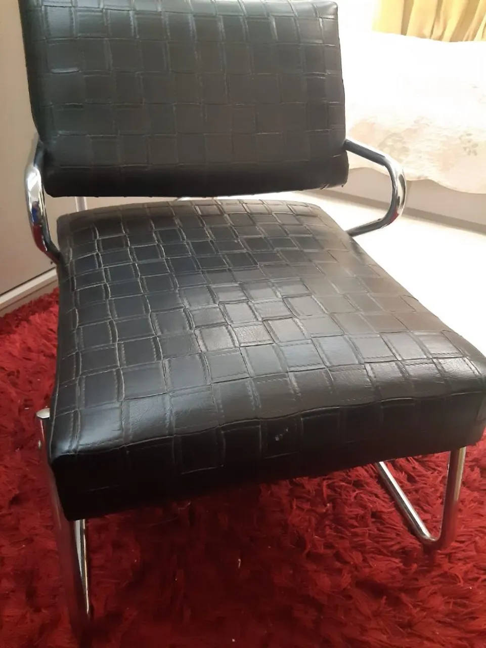 Poltrona em couro preto e estrutura em aço inoxidável, em excelente estado de conservação. Tenho 2 unidades. Cada uma por R$ 400 e o par por R$ 700
