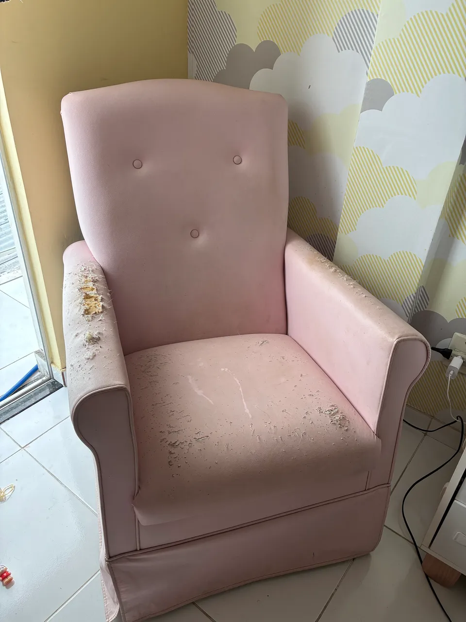 Poltrona de balanço para amamentação. Precisa ser re-encapada, pois o revestimento está todo rasgado (culpa das gatas de casa).