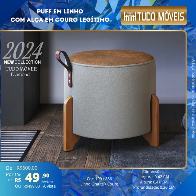 Puff Miami, confortável e resistente, pés em madeira maciça, revestimento em linho com o assento de alta qualidade, estrutura em madeira de florestamento, ja vai montado pronto para utilizar.