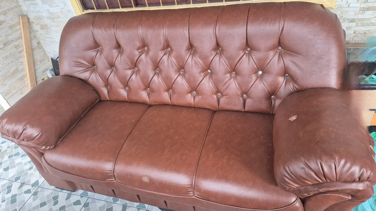 Sofá elegante de 3 lugares em courino na cor marrom com detalhes em capiton?, muito bem conservado, com duas pequenas marcas de arranhado. Conforto e estilo em um só móvel. Todo durinho.