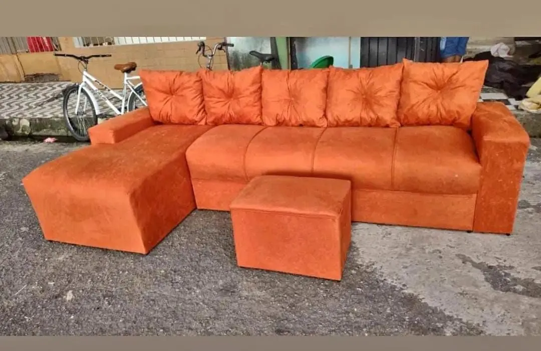 Sofá aparti de 550 de canto confortável e moderno, com design elegante na cor laranja vibrante. Acompanha um puff para maior comodidade e versatilidade.