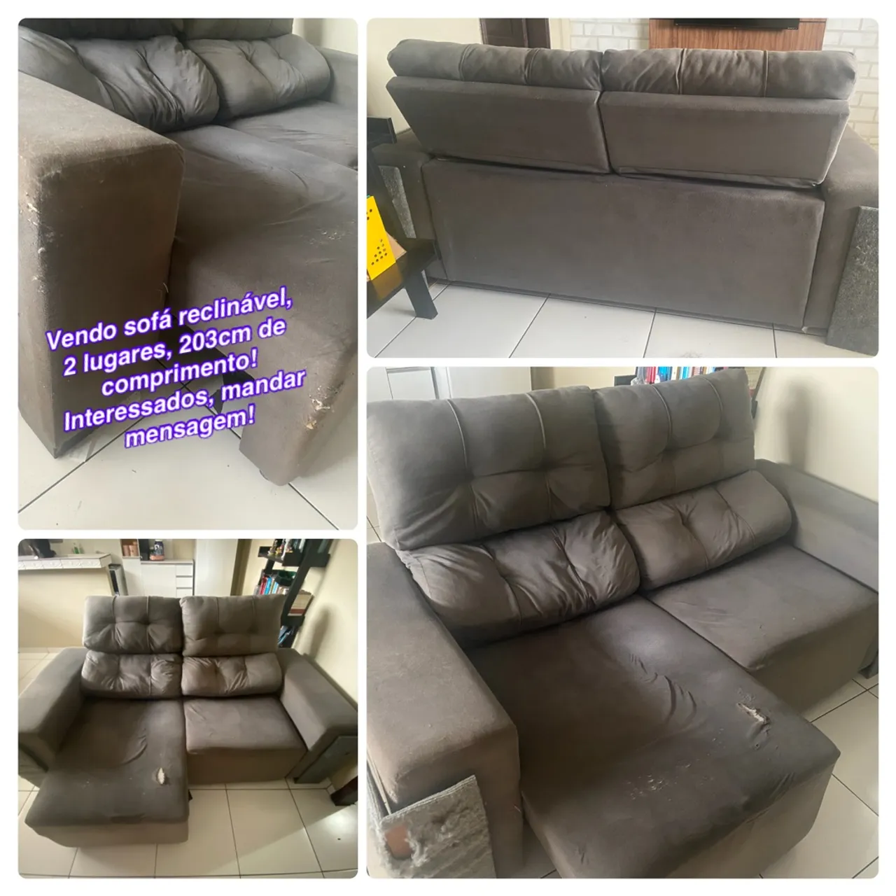 Sofá reclinável e retrátil, 203cm de comprimento, cinza chumbo, confortável, marcas de uso conforme as fotos!