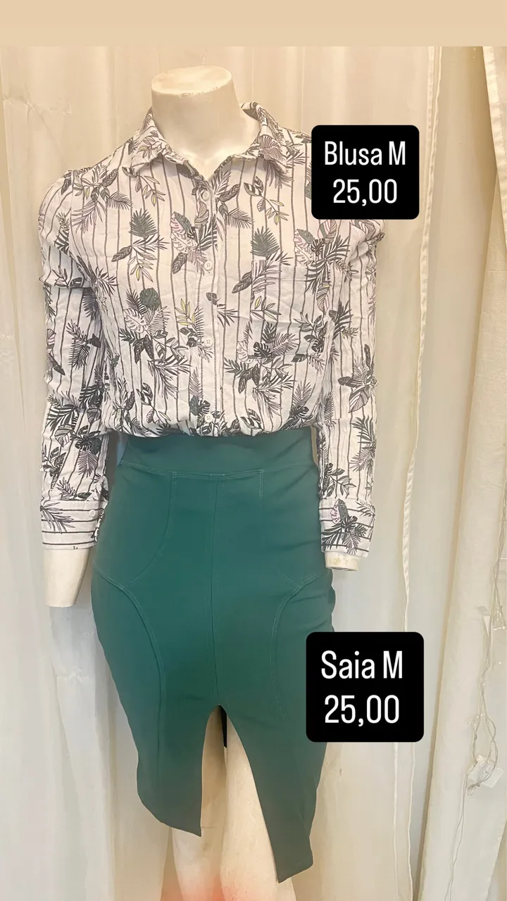 Conjunto elegante e moderno, perfeito para diversas ocasiões. A blusa estampada com detalhes florais e listras traz um toque de sofisticação, enquanto a saia verde adiciona um charme único ao visual. Combine estilo e conforto com este conjunto!