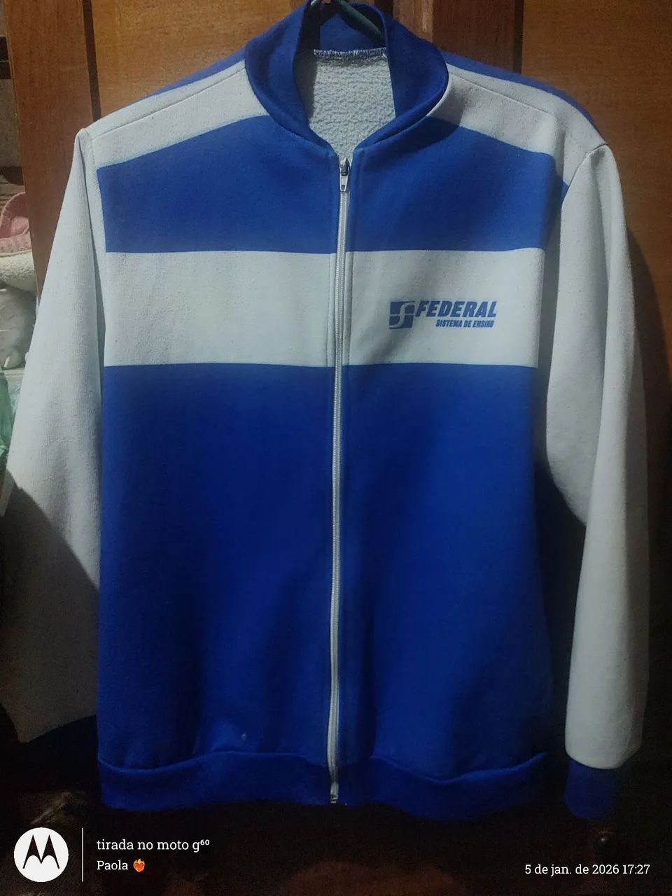 Casaco escolar azul e branco, colégio federal.