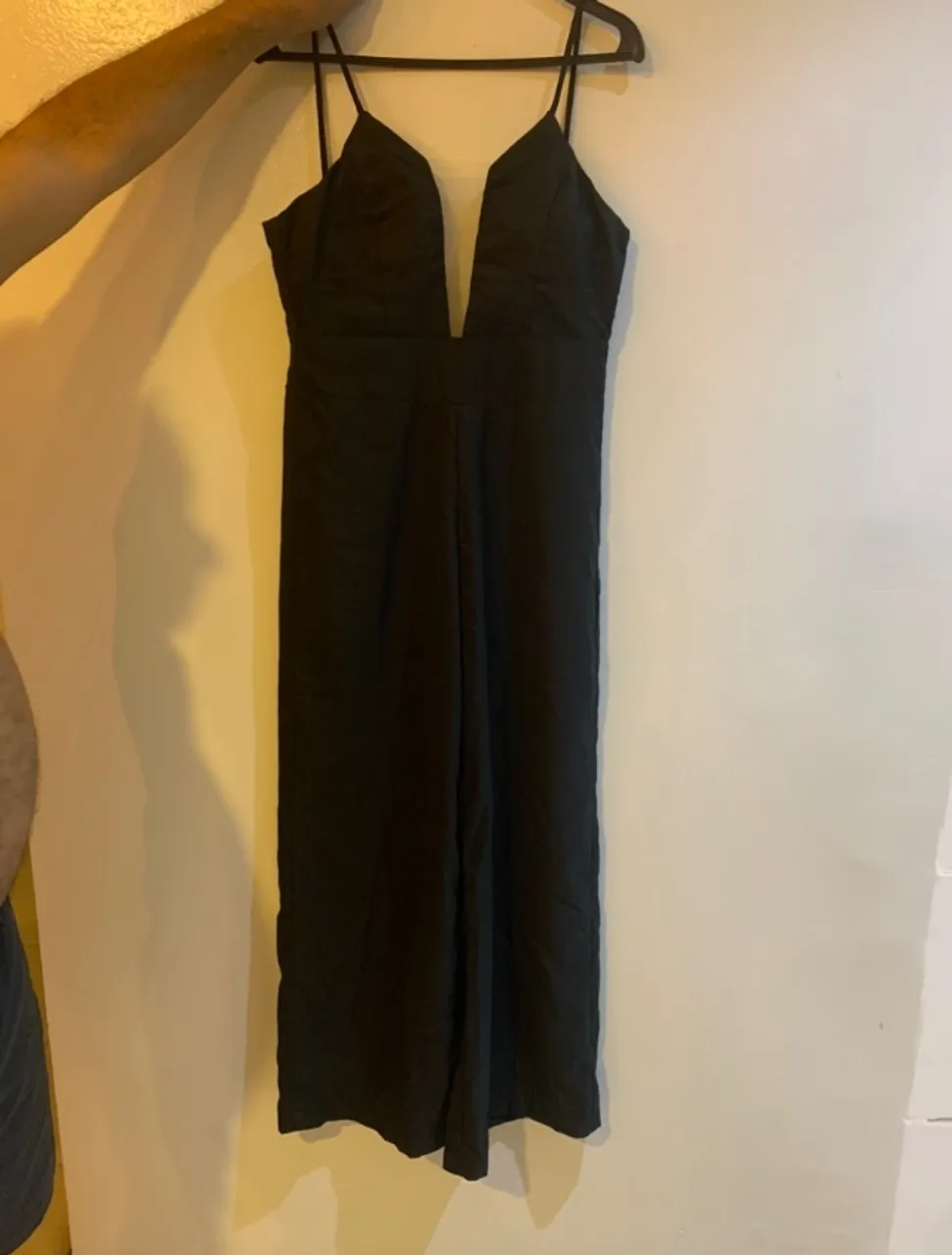 Macacão preto com decote em V, ideal para eventos especiais. Tecido leve e caimento impecável. Sofisticação e conforto em uma só peça!