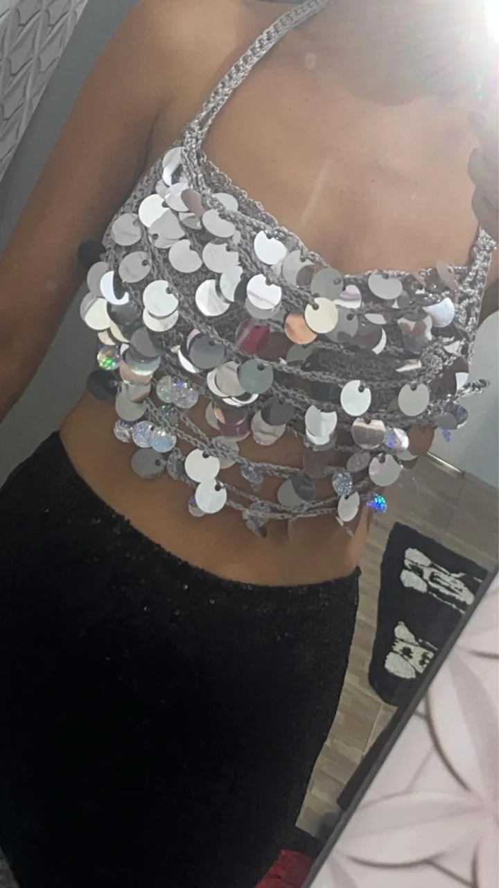 Deslumbre com este top de crochê adornado com paetês! Perfeito para adicionar um toque de brilho e estilo único ao seu visual.