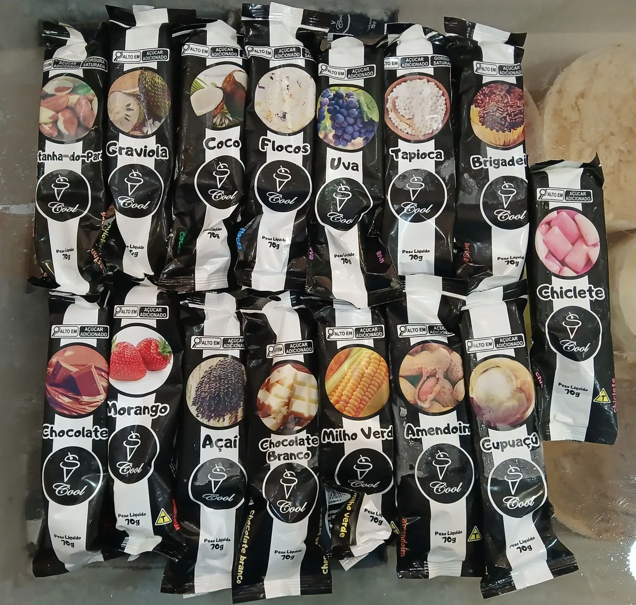 Sabores: Açaí, Amendoim, Brigadeiro, Castanha, Cupuaçu, Coco, Chocolate, Chocolate Branco, Chiclete, Flocos, Graviola, Milho, Morango, Tapioca e Uva
