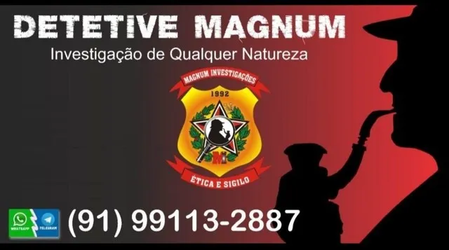 MAGNUM INVESTIGAÇÕES é uma empresa do ramo de investigações particulares com o maior sigilo e descrição. Prestamos uma variedade de serviços de investigações, seja na esfera pessoal ou corporativa. Conta com uma equipe de detetives especializados que seguem o código de ética da profissão e equipamentos de última geração. O nosso trabalho é apresentar uma solução para o problema de seus clientes através de provas reais (imagens, áudios e documentos) que comprovem ou não a suspeita, com total certeza e máximo sigilo. Alguns de nossos serviços: Investigações empresariais, industriais e comerciais. Espionagem de celulares, roubos, desfalques e sabotagens. Rastreamento de veículos via satélite em tempo real. Busca por óbito, detenção de escuta não autorizadas, antecedentes. Investigação de seguro, infidelidade. Localização de pessoas desaparecidas. pesquisa por número de telefone. Pesquisa por nome, placa de carro, relatório de endereço e levantamento de provas para inquérito criminal. Todas as áreas da investigação. Seu serviço será gravado, filmado e/ou fotografado para fins judiciais ou particulares em geral. Locação e venda de micro equipamentos de investigação. Para melhores informações, ligue-nos para um orçamento sem compromisso ou solicite a visita de um de nossos agentes em sua residência ou empresa. Atendemos em qualquer parte do Brasil. Fone e WApp (91)... ver número 24hrs. (Não respondemos chat) Trabalhamos de Forma Rápida segura e eficaz. A discrição e sigilo fazem parte de nossa vida e trabalho.