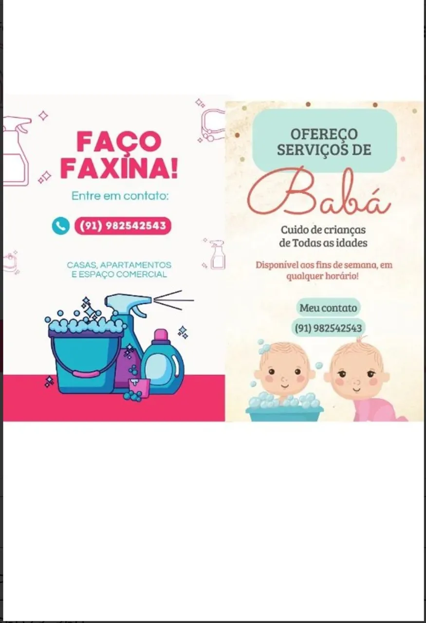 Faço limpeza em residências, cuido também de bebês e de crianças com maior idade.