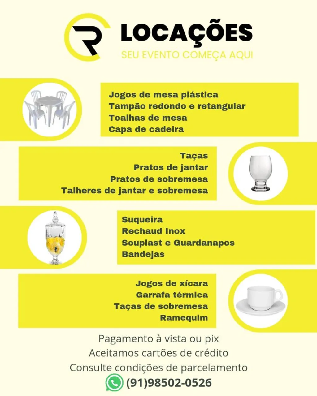 Seu evento começa aqui. Alugamos mesas, cadeiras, tampões, toalhas, cobre mancha, capas de cadeira, louças e muito mais!! Faça já seu orçamento sem compromisso. Contato:
