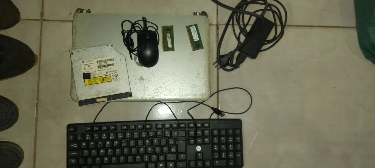 Conjunto de peças para notebook com i5 de 4°geração HP, incluindo leitor de CD/DVD, memória RAM dois pentes sendo um de 2gb e outro 4gb de memória DDR3, mouse, teclado e fonte de alimentação. Ideal para quem precisa de componentes para reparo ou projetos.
