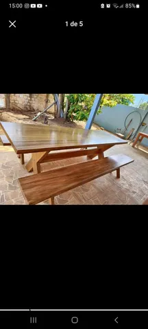 Mesa rústica medindo 2, 50 por 1 metro de largura, acompanha dois bancos