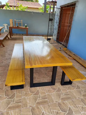 Mesa rústica medindo 2, 50 por 1 metro de largura, acompanha dois bancos