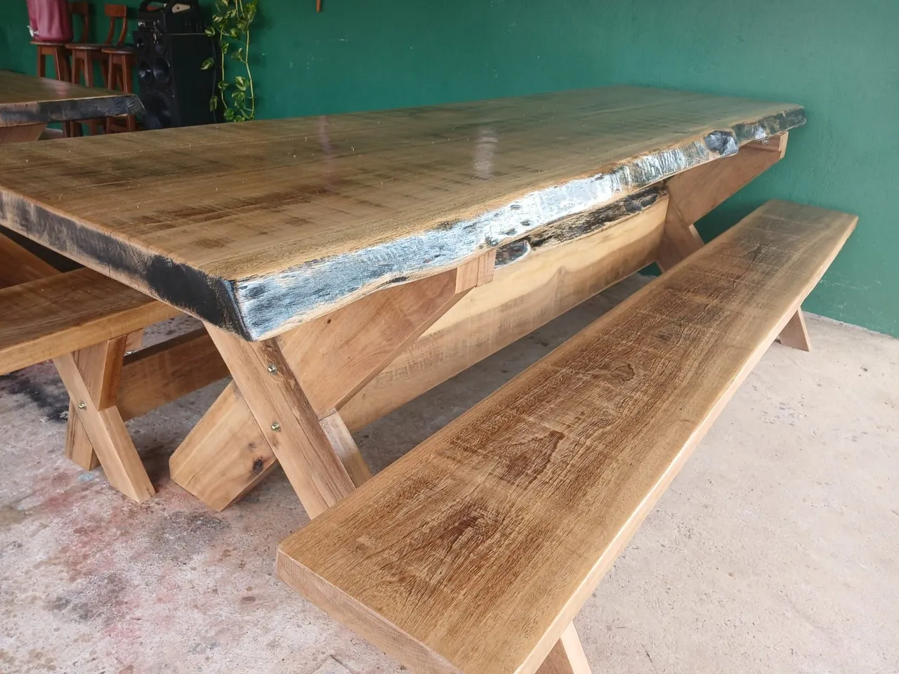 Temos mesas rusticas a pronta entrega de 3mts com par de bancos temos tambem tabuas para carne gamelas para frutas e portoes massaranduaba entrada de fazenda chácara.